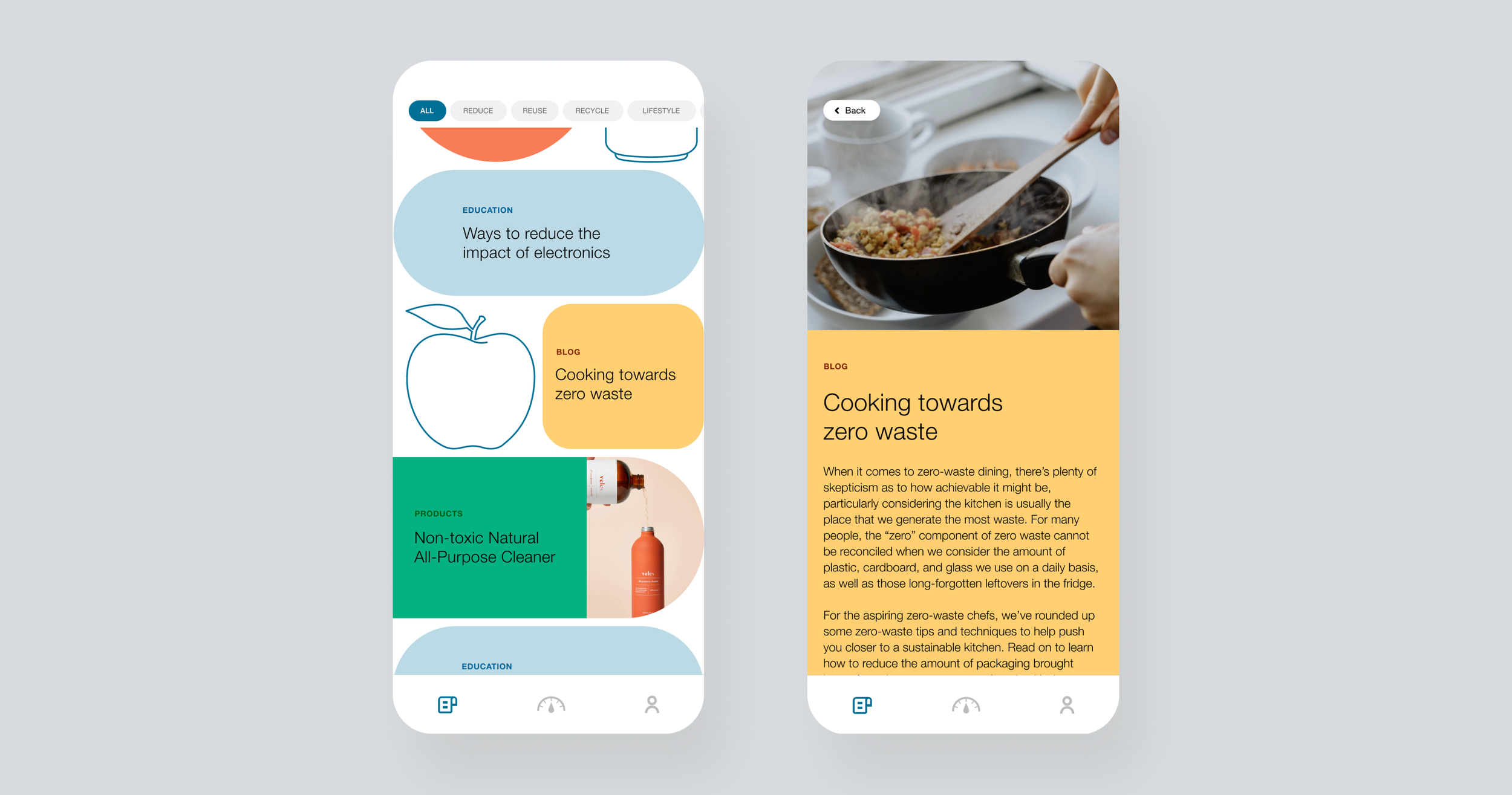 We created an app that, in addition to helping people keep track of their trash vs. recycling days, inspired daily engagement through sustainability education and tracking. The more someone explored the app, read the articles, checked out product recommendations, and completed recycling challenges, the higher their sustainability score.