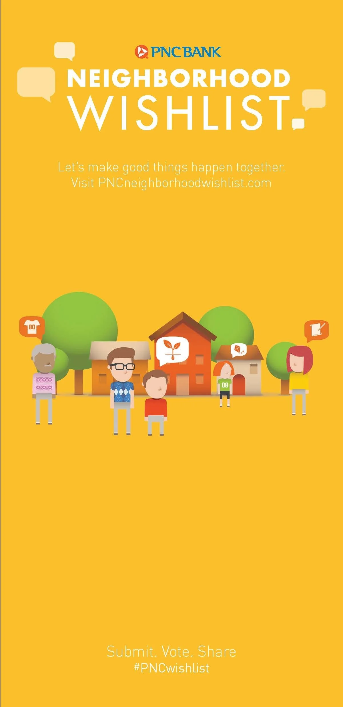 PNC Neighborhood Wishlist was a social community initiative where PNC invited individuals to submit ideas for ways they'd like to help their neighborhood. We created a microsite, posters, flyers, and other collateral to help encourage participation. Then, 100 finalists were chosen and received $1 for every person who voted for their neighborhood project on Facebook.